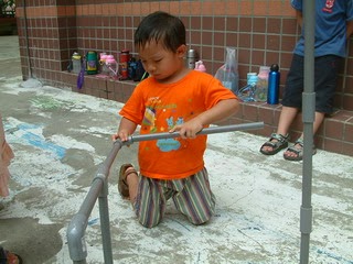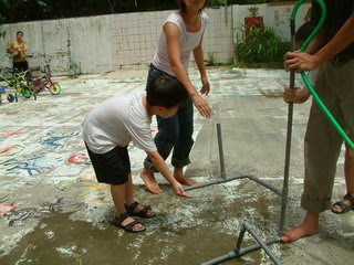 因颱風缺水引起老師帶孩子觀察佑佑家的水井,這星期老師延續前面的教學,帶領孩子上頂樓看大樓的水塔,談到水與壓力的問題。這星期以前面經驗為基礎,老師將水的壓力、水流,以及水管方向與接頭的關係這些概念加入教學中,讓孩子透過實際操作與遠方的知識相連結。